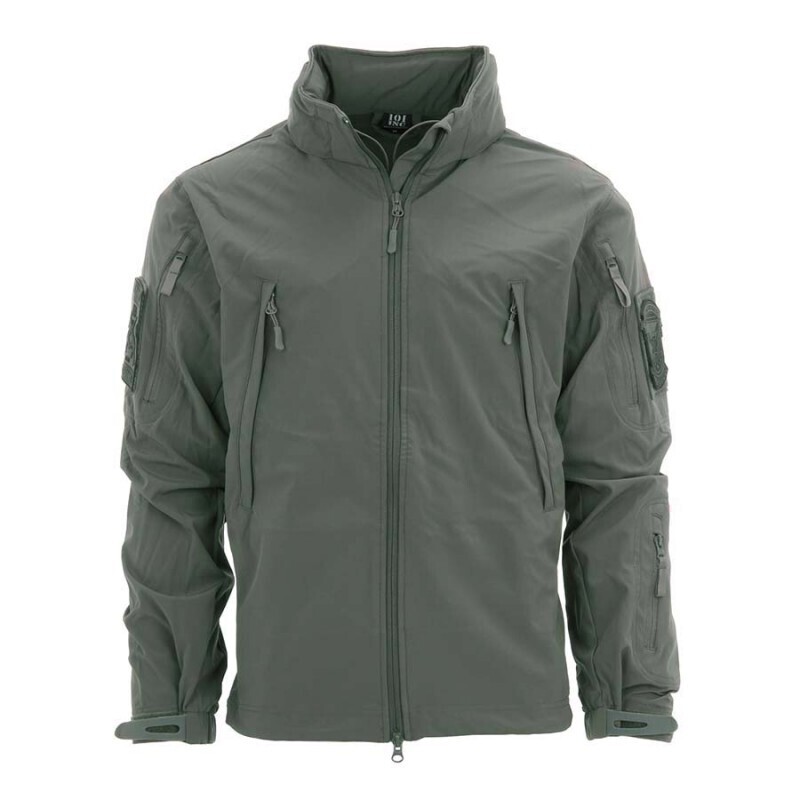 Softshell jack met oprolbare capuchon, hoge kraag, zakken met ritssluitingen en velcro patches.