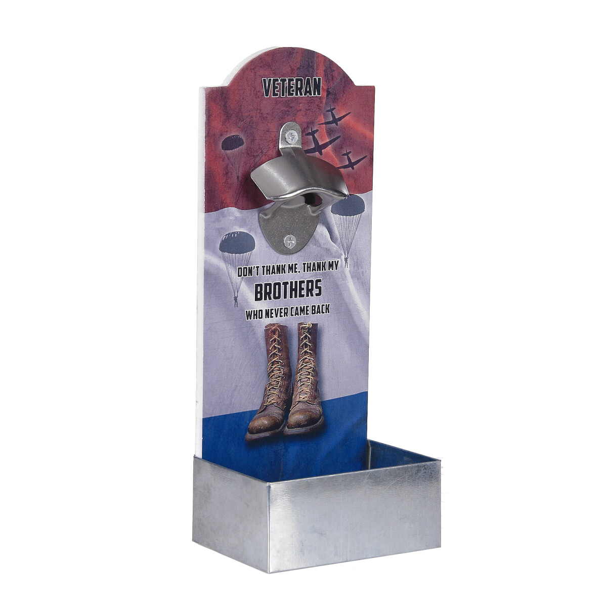 Flesopener om aan de wand te hangen. De flesopener is voorzien van een metalen opener en een metalen opvangbakje voor de doppen. Het houten paneel is voorzien van een leuke bedrukte print/tekst en aan de achterzijde zit een metaal ophangsysteem zodat de flesopener direct opgehangen kan worden.